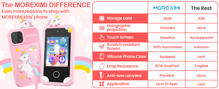 - 3D Holographic Projection Pyramid - Transform ordinary visuals into extraordinary 3D holograms! The MOREXIMI toddler phone come with a holographic pyramid, brings characters, animals, and other fun visuals to life in stunning three-dimensional projections that will captivate your child's attention. (There are many free playback material available online that you can search for, and people who enjoy research can try to make their own videos.)