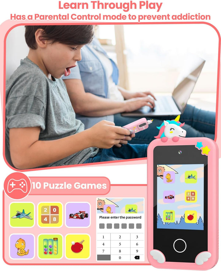 - Interactive Learning Games - This mini iphone for kids packed with 10 educational games, promotes learning through play. Your child can enhance their math, language, and problem-solving skills with engaging, interactive content that adapts to their learning pace. Parental Controls: Set password to prevent children from becoming addicted to games. (Initial password: 000000)