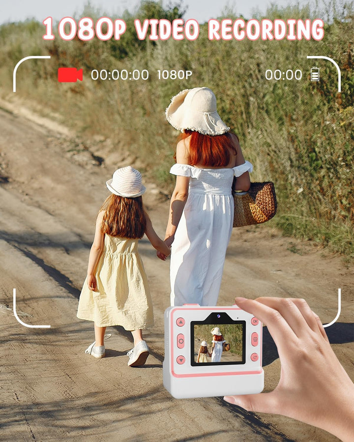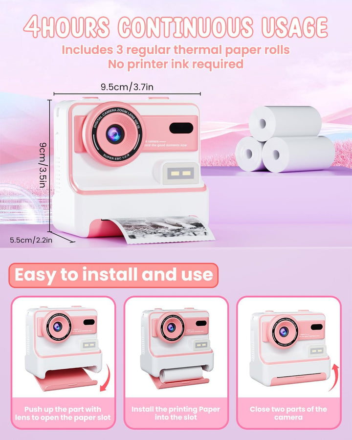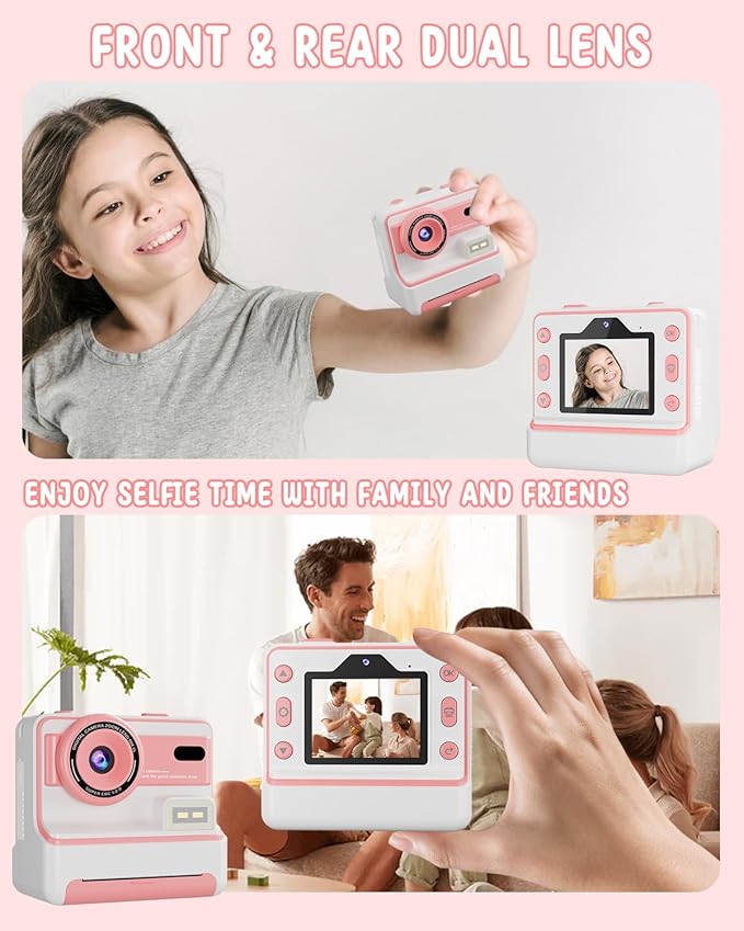 - đ¸ăSelfie Dual-LensăThe Kids Instant Print Camera is equipped with both front and rear lenses, providing endless possibilities for capturing stunning photos. Whether they're taking selfies, documenting their surroundings, or exploring different perspectives, this dual-lens setup ensures versatile and high-quality shots every time.